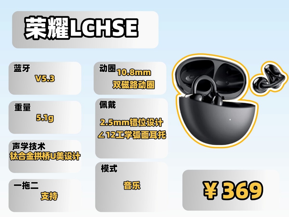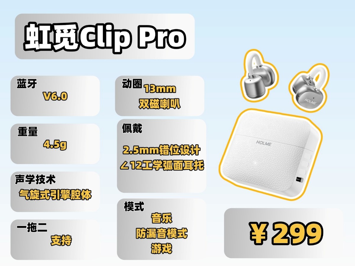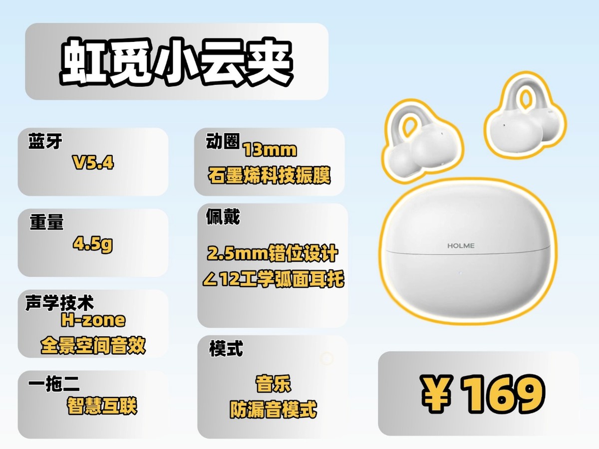 这款耳机采用的是前高后低的2.5mm错位设计,上耳后耳机巧妙适应耳朵轮廓,实现真正贴合人体工学的佩戴体验。加上∠12°弧面耳托将电池仓提供了舒适的承托支点,紧贴耳背,合理的了分散压力,可以有效避免传统耳夹式耳机的夹耳感。还有单耳4.5g的轻量化设计,音质上采用的是13mm石墨烯科技振膜单元,有着出色的形变能力,音质不易失真,确保了声音细节的高度还原。同时具备H-zone全景空间音效技术创造出更强的声场表现,声音的空间感。还有虹觅声学实验室的专业调试,让声音不被过度修饰,让三频表现都均衡自然。性能方面它搭载了自研的防漏音模式,可以有效控制声音外泄,保护隐私。加上HBC智慧双联功能支持双设备智能切换。还有蓝牙5.4芯片确保稳定的连接性能和高效的传输表现。以及IPX5防水等级应对日常汗水和雨水侵袭,配备双麦克风ENC通话降噪保障清晰的通话质量。还有着8小时单次续航配合充电仓可达24小时综合续航,全面满足日常使用场景的需求。