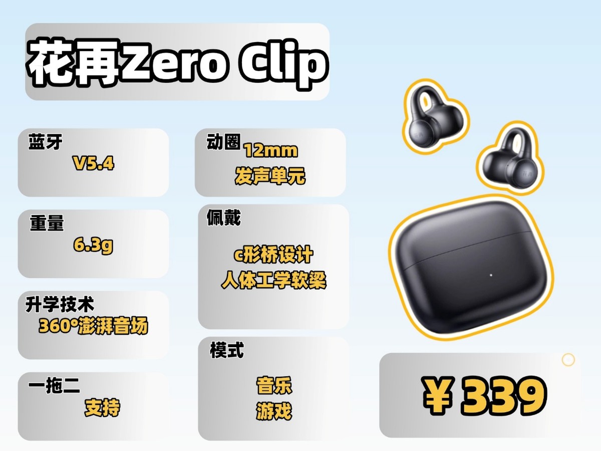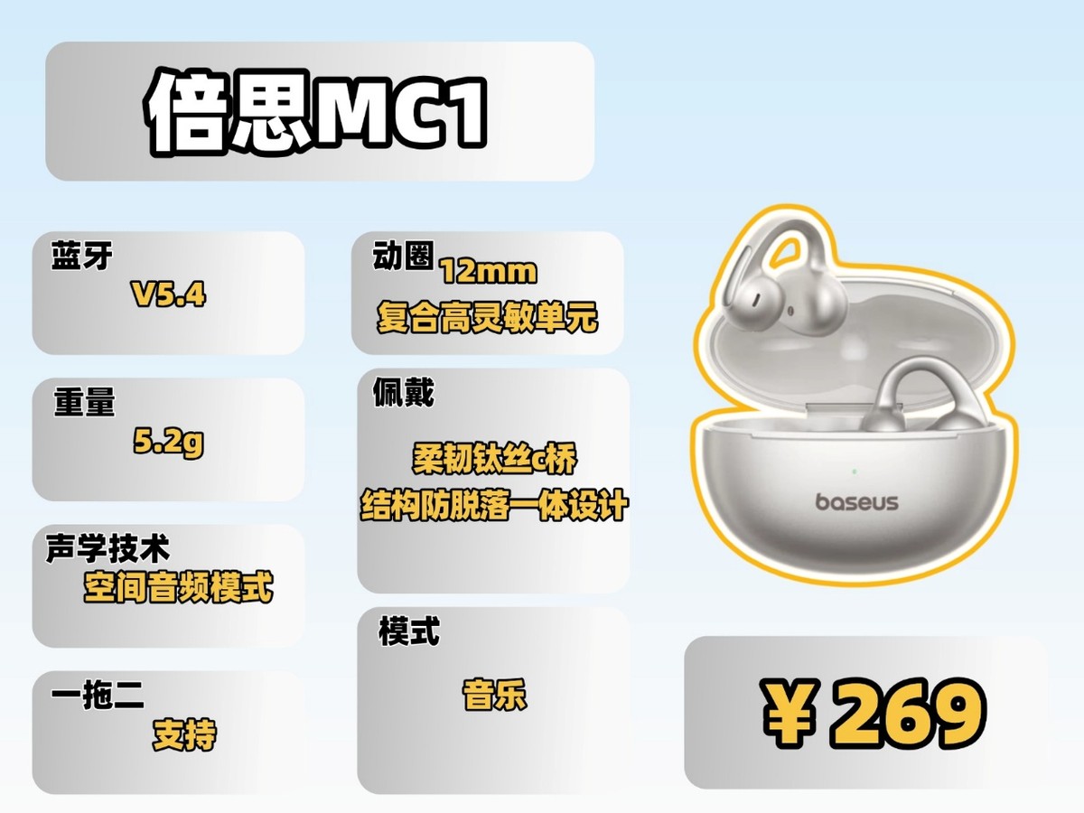 它采用的是C形桥设计加上 12° 黄金夹角的工学结构,即使是骑车、蹦极这类剧烈运动,耳机也不会掉。就是单耳 6.3g 的重量,在同类型耳夹耳机表现出色,戴久了耳廓会明显觉得压得慌,舒适度只能算一般。它的音质亮点主要在低频,12mm 钛蓝复合振膜单元配合 BassTurbo 低音增强引擎,低频十分强劲,下潜也够深,听节奏感强的歌特别带劲。中高频的细节表现还算可以,整体音质算突出的,但漏音问题挺明显的。它有着蓝牙5.4稳定连接与一拖二功能,配备双麦克风ENC通话降噪系统,通话清晰度良好,具备IPX6高级别防水性能,无惧汗水和雨水侵袭,但单次续航只有7小时,综合续航28小时,续航表现相对较短,且只有音乐模式。