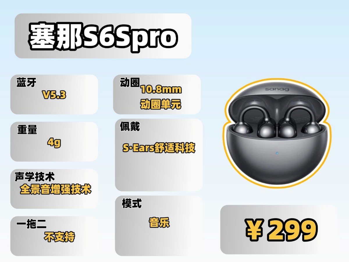 塞那S6Spro使用的是C形桥结构结合贴合耳廓设计,4g的轻量化设计在同类型的产品中表现出色,长时间使用时也完全没有,几乎无压迫感。耳夹接触点经过了人体工学优化,可以自适应不同耳型,日常通勤,办公场景下舒适度出众。这款耳机搭载的是10mm动圈喇叭单元,还搭配了全景音增强技术,声场表现十分开阔,人声部分清晰度表现出色。但低频下潜深度很一般,高频延伸表现普通,整体音质处于同价位产品的一般水平。漏音明显,对音质有较高要求的用户可能需要调低预期。它还支持蓝牙5.3芯片确保连接稳定性,游戏模式下延迟低至40ms。双麦ENC通话降噪系统在常规环境下表现可靠,IPX4防水等级可应对日常使用场景。8+42小时的超长续航表现突出,轻松满足长时间使用需求,但不支持一拖二功能,在多设备切换便利性上不咋地!