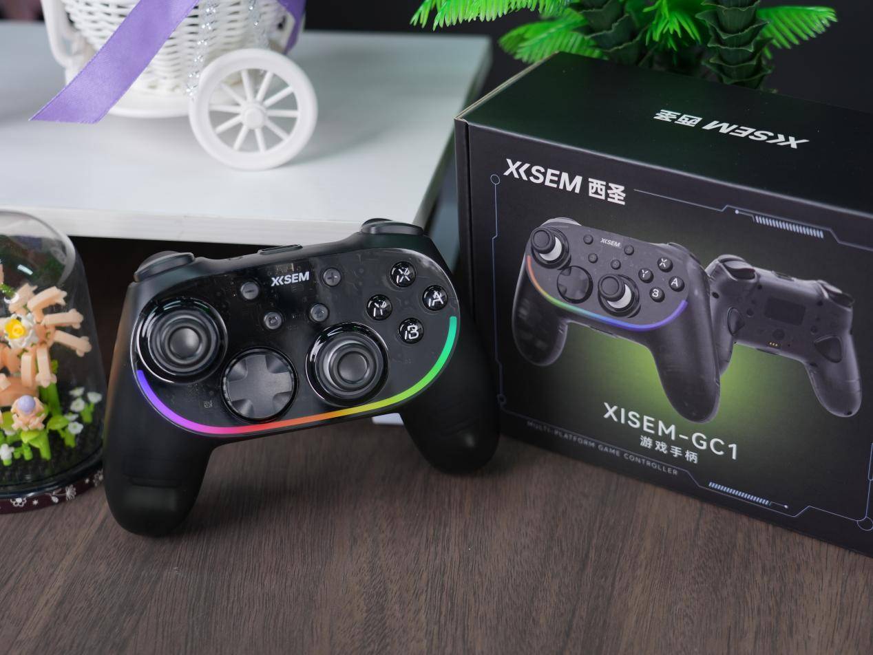在配置表现上,西圣GC1同样强悍,搭载电竞级极速连接引擎,1000Hz回报率与智能抗干扰算法将输入延迟降至0.5ms,支持2.4G、蓝牙和Type-C三模连接,兼容Switch、PC、手机等主流设备,实现“所想即所控”。原生六轴体感传感器可捕捉旋转、倾斜和挥动等动作,1ms级低延迟与1:1映射带来沉浸式操控体验。手柄设计轻量化(214g)、握角科学(15°)、NanoSkin亲肤防滑涂层贴合手型,握持舒适稳固。半透明幻雾晶透机身结合RGB灯效和10种炫酷模式,科技感十足,同时兼具耐磨与防指纹性能,让手柄不仅手感极佳,也十分赏心悦目。