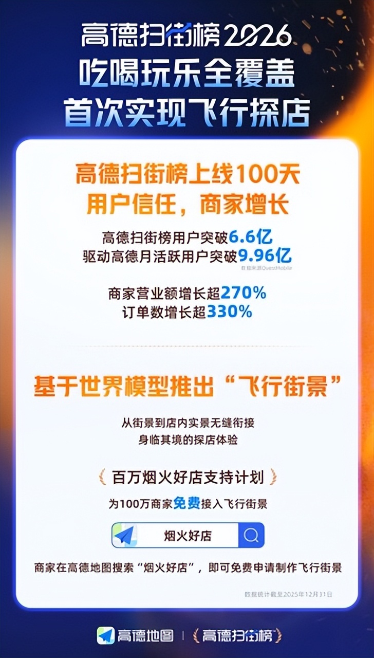 从“用脚投票”的真实榜单,到“身临其境”的飞行街景,再到“百万烟火好店支持i计划”的全面落地,高德正通过不断进化的产品和坚定的资源投入,服务亿万用户的真实生活,助力百万线下商家的长效经营。