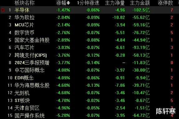 板块题材看,两市个股普跌,次新股、旅游、保险、房地产、种业、钴金属、云游戏等板块跌幅靠前;芯片、数字货币、半导体、EDA概念等少数板块上涨。今天走势最强的是芯片半导体板块,海光信息、寒武纪、华海清科、珂玛科技、龙图光罩、容大光感、鼎龙股份等多股创历史新高,台基股份、捷捷微电、国民技术、新相微等10余股涨停。2024年成立的大基金三期注册资金3440亿元,募资规模较前两期进一步提升,后续亦有望逐步开启投资。国内半导体制造整体的产能缺口仍大,尤其是先进芯片领域有巨大提升空间。预计未来1一2年内,AI对半导体需求的拉动有望从高端算力及存储芯片逐步下沉到更广泛的消费电子终端领域。所以,芯片半导体板块的行情应该是远远没有结束的。今天跌幅靠前的板块主要是房地产,保险等蓝筹股,房地产虽然出现了一堆刺激政策,但销售数据并不是很好,9月单月百强房企销售额环比增长0.4%,同比下降38.1%,降幅较8月扩大10.3个百分点;销售面积环比下降1.6%,同比下降41.6%,降幅较8月扩大13个百分点。引发了这个板块走弱,特发服务跌近16%,金地集团、滨江集团、万科A、招商蛇口、中交地产等多股跌停。不过,9月底地产政策迅速落地,央行完善房贷利率定价机制,一线城市进一步优化调控政策,后期房地产板块还是值得期待的