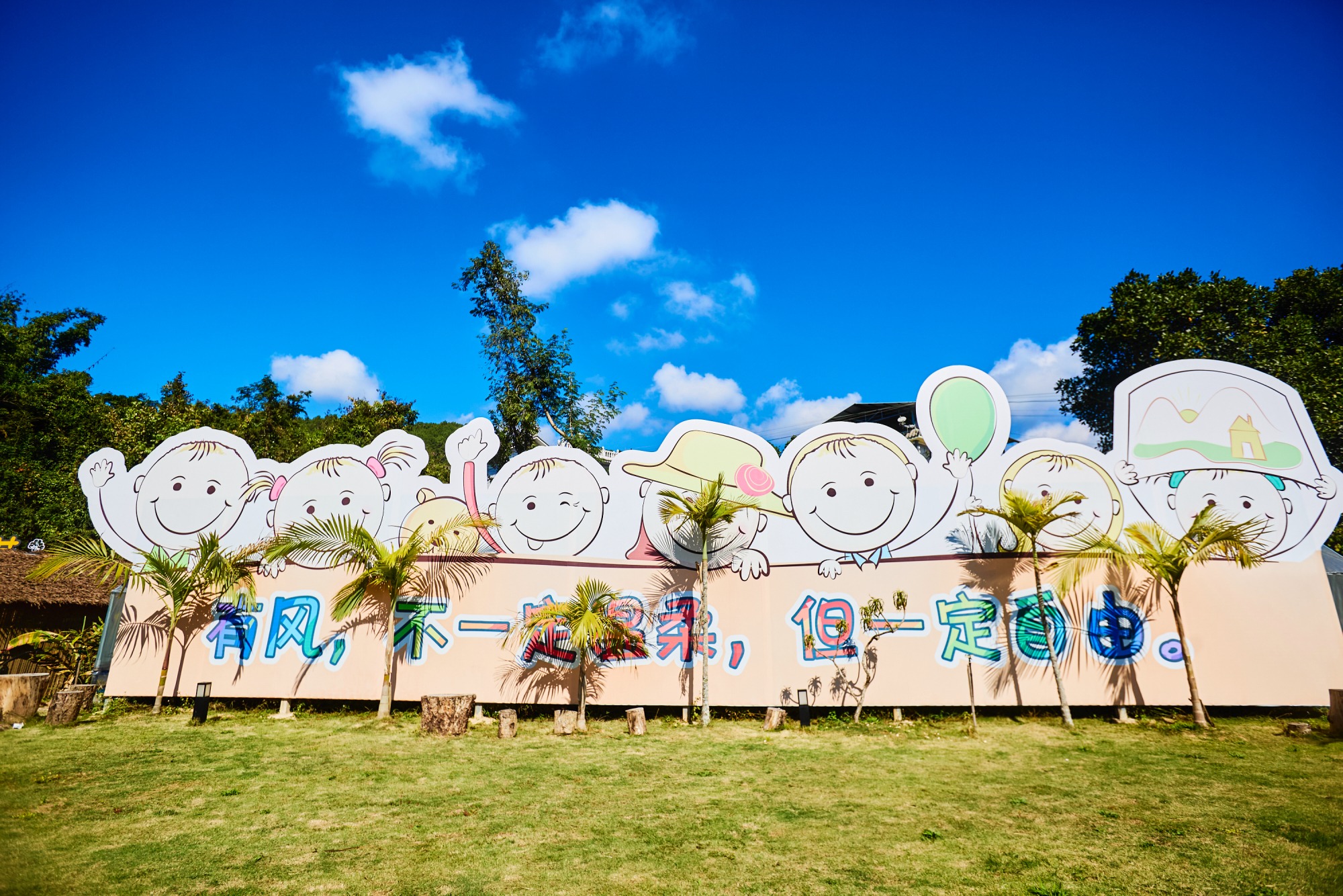 标语墙搭配卡通人物造型,背后是湛蓝天空,随手一拍就是充满童趣和治愈感的照片。