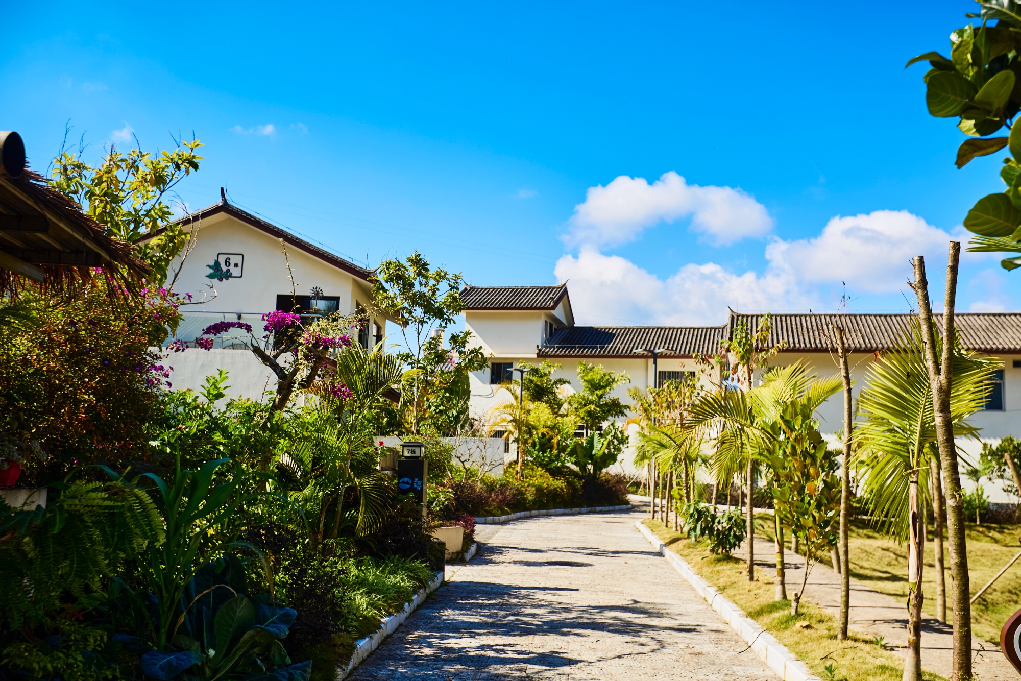 村子街巷齐整,屋舍俨然,热带绿植生机盎然,白墙黛瓦的房屋高低错落,沿着石板路慢慢走,村子的静谧与清新让人着迷。