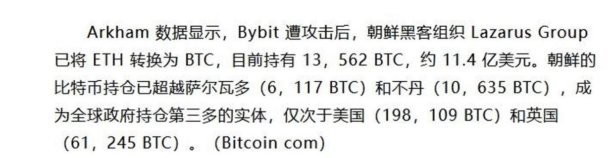 朝鲜为何成为比特币持有大国最近啊,有个专门研究加密货币的机构放出了个数据,说朝鲜这个平时挺低调的国家,居然一下子超过了前面的两个国家——萨尔瓦多和不丹,成了仅次于美国和英国的世界第三大比特币持有国。他们手里有13563枚比特币,市值高达11.2亿美元。一说到朝鲜,很多人觉得它特别低调,对美国的强势态度也不太买账,跟别的国家往来也不多。那为啥朝鲜会在加密货币这件事上这么出挑呢?金正恩到底在搞什么名堂?其实金正恩这步棋是有深意的。美国和朝鲜的关系一直不太好,美国也一直把朝鲜当成心头大患。在美元主导的国际金融体系里,美国早就把朝鲜排除在外了。但现在呢,全球的金融和贸易体系还是被美元牢牢控制着。换句话说,朝鲜要是想在美国主导的体系里做生意、做交易,就得用黄金来当“硬通货”进行交割。但问题是,黄金虽然值钱,却是稀有的东西。就算是美国联邦储备银行存着世界上最多的黄金,也不可能随便拿出来用。在这种情况下,朝鲜就想到了加密货币,比如比特币这种去中心化的数字资产。它们不需要经过传统金融机构,也不受单一国家的控制。就在2月21号那天,这个消息一出来,整个加密货币圈都炸锅了。朝鲜这个低调的国家突然成了比特币持有量的“大玩家”,确实让人意想不到。
