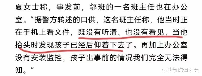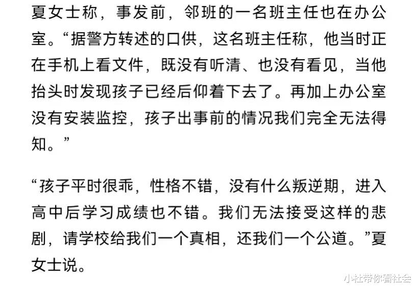 家长接到学校电话后,心急如焚地赶到医院,但最终等来的却是孩子因伤势过重而去世的噩耗。孩子的离去,对于父母来说,如同晴天霹雳,他们多年的希望和梦想瞬间破灭。他们无法接受这样的结果,开始寻求事件的真相。家长的疑问重重:孩子为何会坠楼?在办公室里到底发生了什么?他们要求查看教室和办公室的监控录像,希望从中找到答案。然而,办公室并没有安装监控,这无疑增加了事件的神秘性。家长开始怀疑,是否在办公室里发生了不为人知的冲突,导致了这场悲剧。