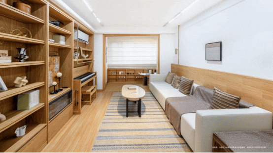 当晨光漫入约65㎡一居的1+X弹性空间,独居的奋斗者可在此找到自由与秩序的平衡——白日是专注工作的书房,夜晚化为好友小聚的社交场;当生活步入二人世界,空间亦随之延展,让亲密关系在舒展中生长。