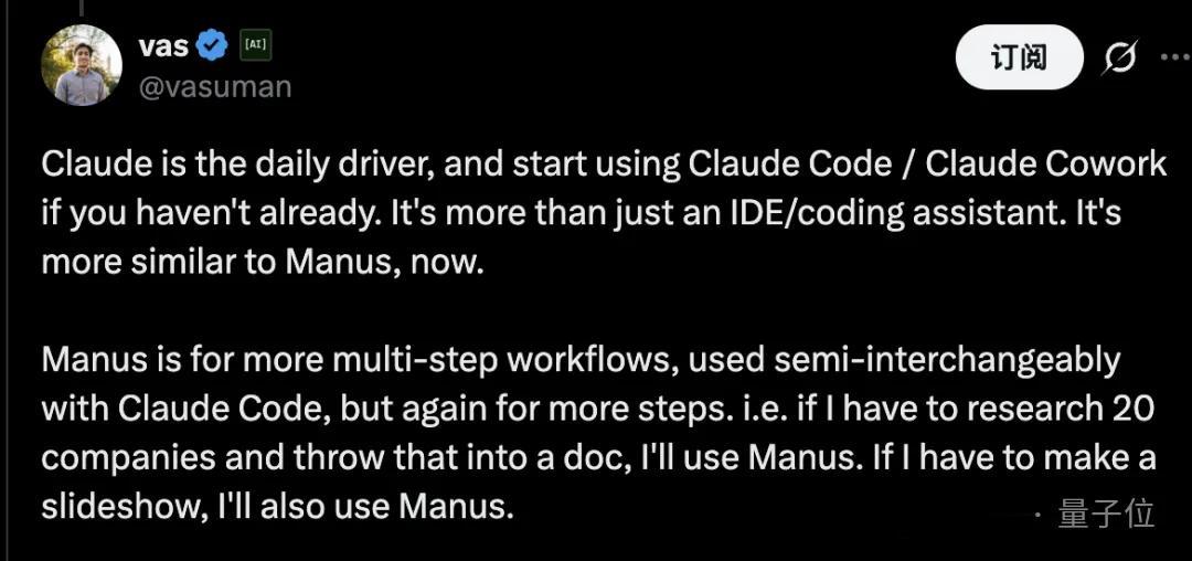 一位网友分享Manus适用于更多步骤工作流程,如果需要研究20家公司并将结果整理成文档,他会使用Manus。如果需要制作幻灯片,也会使用Manus。
