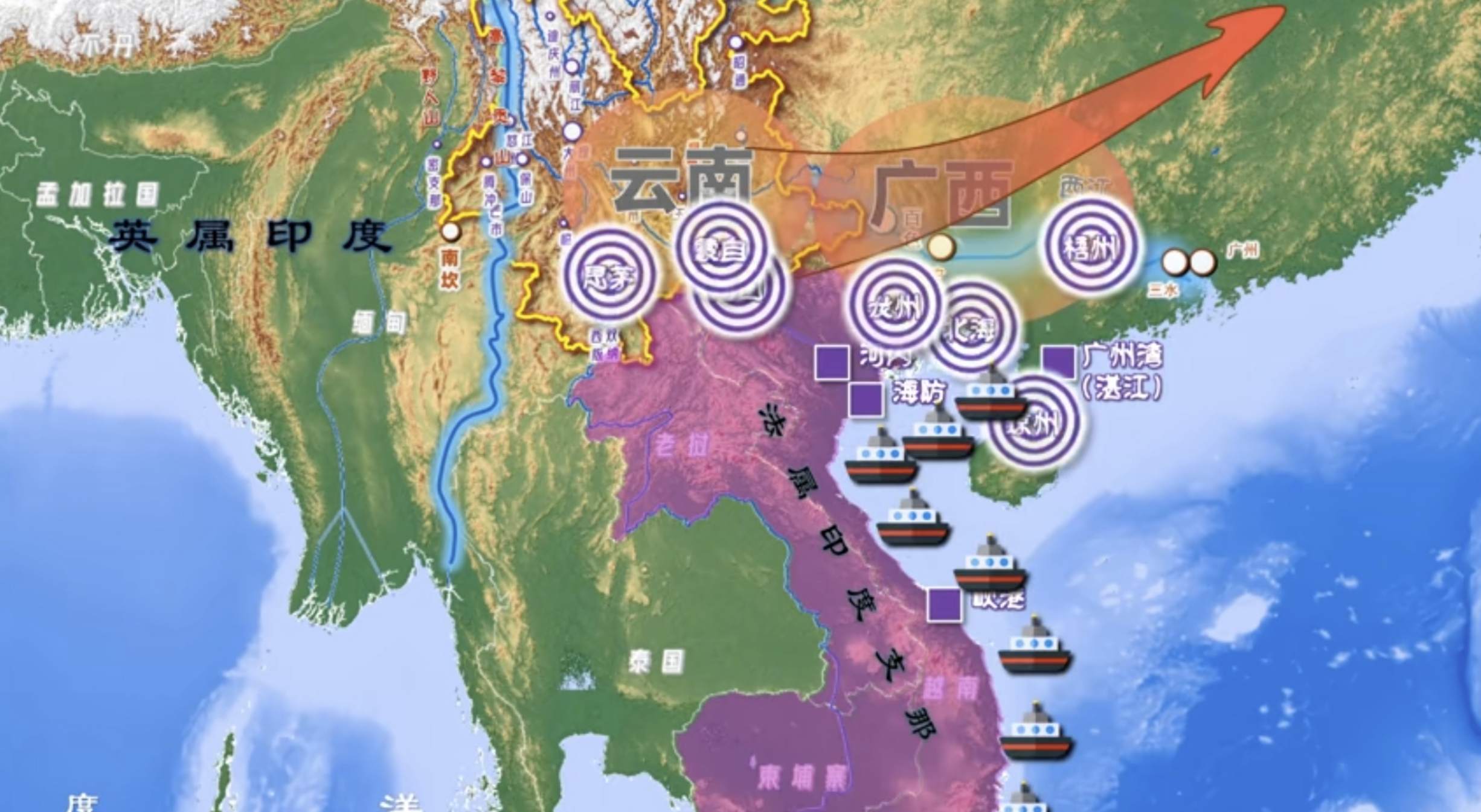 近代历史英国的 “两江一洋” 战略,其中 “两江” 指长江、西江,“一洋” 指印度洋。在 19 世纪的大部分时间里,英国是海上霸主,控制了印度洋西边的苏伊士运河、红海、亚丁湾一线,以及东边的马六甲海峡,基本掌控了印度洋北岸的核心国家,将印度洋变为其 “内湖”。在此期间,英国先后拿下孟加拉、印度、缅甸,构建起英属印度版图。同时,英国以鸦片战争为开端,从东部沿海入侵中国,通过内河航道将势力延伸至长江和珠江流域,其在珠江流域深入到广西西江上游,一定程度上是为了遏制法国的环北部湾战略。