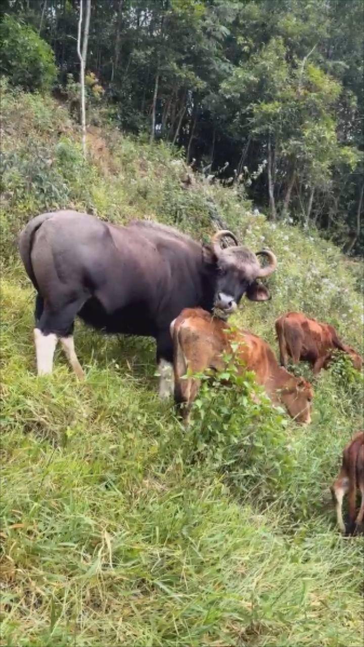 1月4日上午,在云南省普洱市澜沧拉祜族自治县发展河乡,一头国家一级保护动物印度野牛走出树林后,径直混入一农户家养牛群。尽管野牛体型比家牛大了好几圈,但它们却相处融洽。