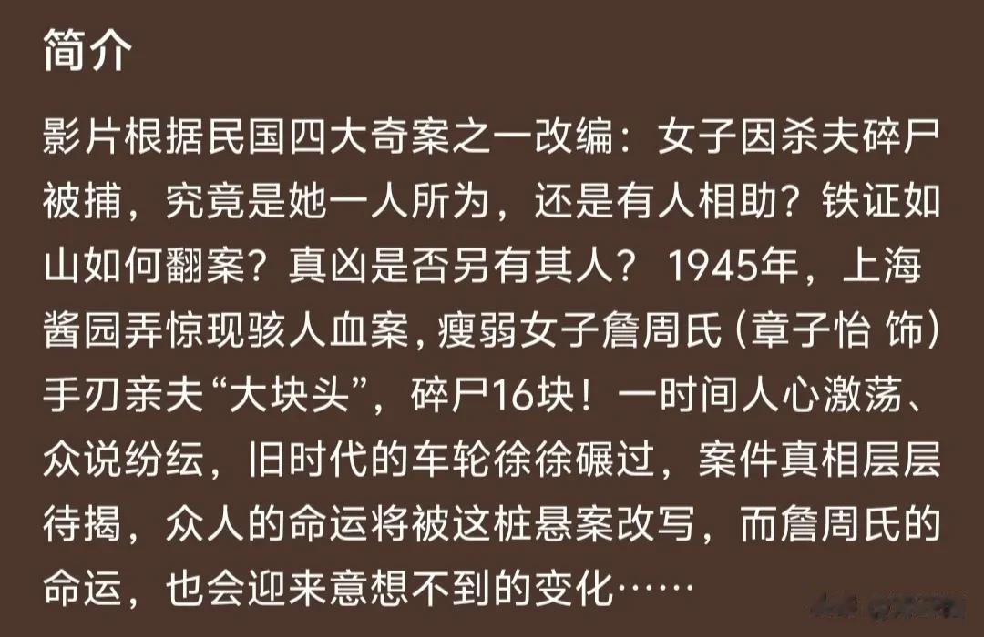詹周氏,生活在40年代上海的底层女性,因长期遭受家暴在绝望中反杀丈夫,轰动一时的杀夫分尸案就此由来。