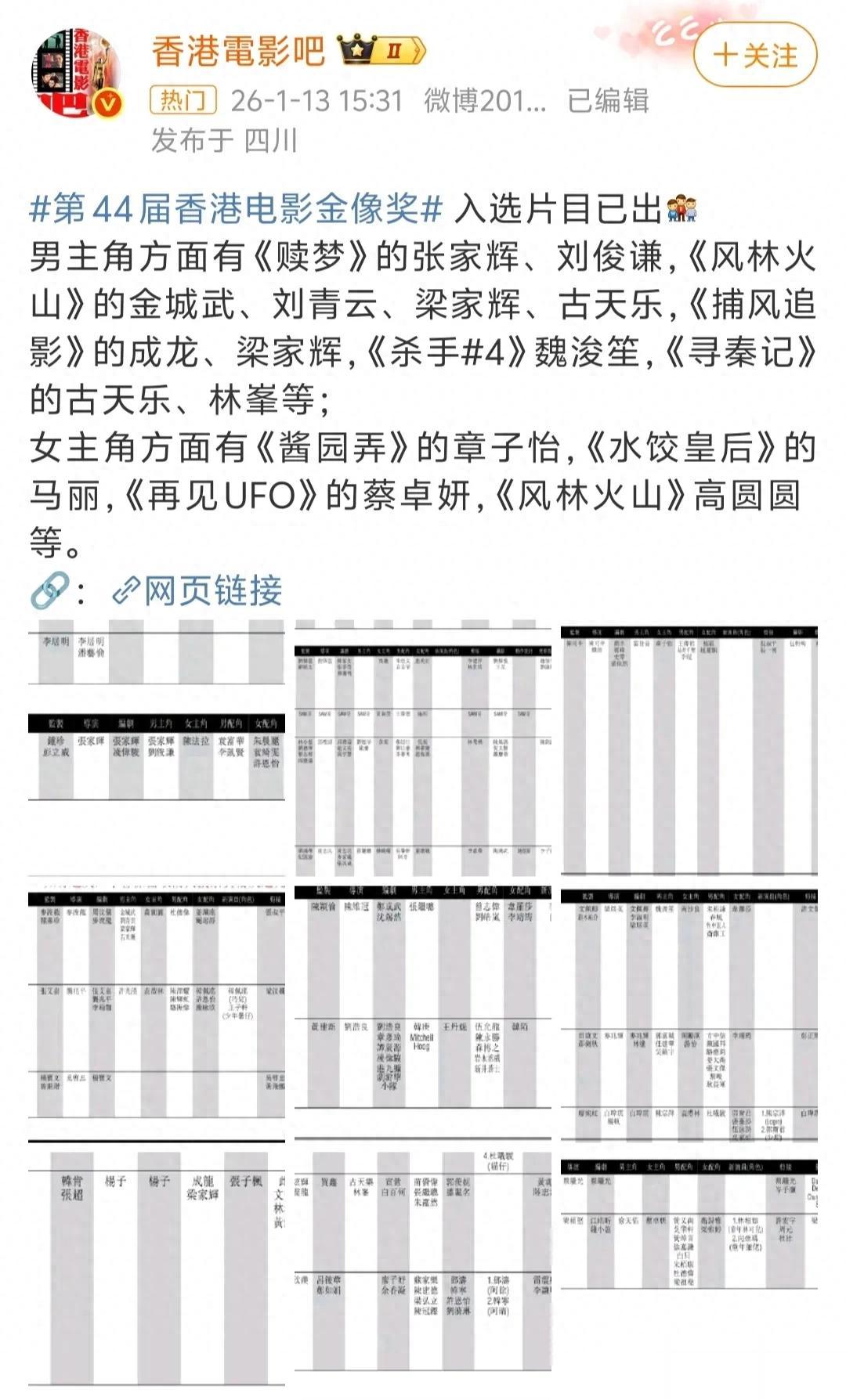 1月13号,第44届香港电影金像奖报名名单正式公布。