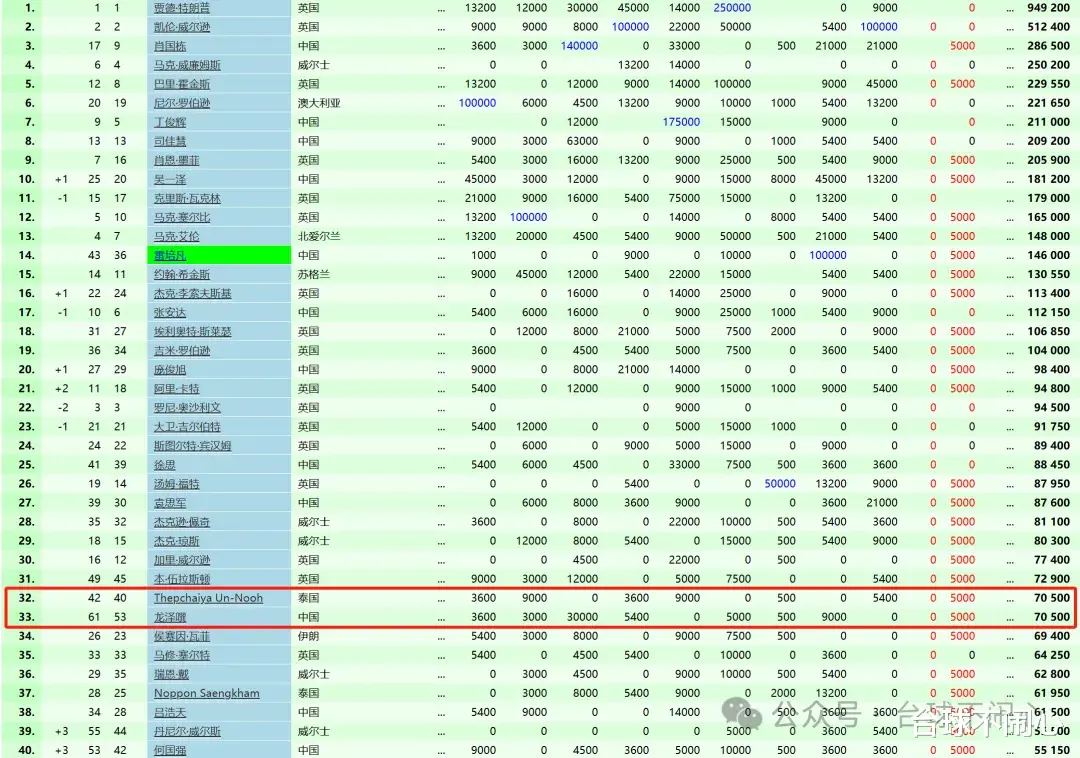 北京时间2月4日,威尔士公开赛打完后就要确定大奖赛的参赛球员了,徘徊在32位的球员很尴尬,塔猜亚和龙泽煌他们的积分相同,目前并列在32位。中国球员有8位保送,也有可能是9位。