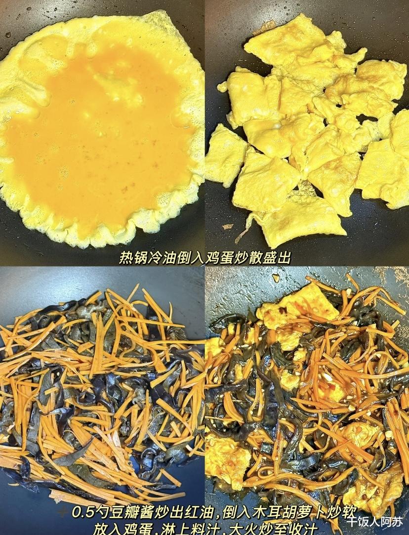 先下胡萝卜丝和木耳丝,大火快速翻炒。这两种食材耐炒,需要多一点时间炒软,但不要炒得太烂,保持一点脆度才好吃。约1分钟,待胡萝卜变亮、木耳微微发软,就可以把之前炒好的鸡蛋倒回锅里。让三种食材在锅里“团圆”,用铲子轻轻翻拌均匀,让鸡蛋裹上红油,木耳和胡萝卜吸收油脂。