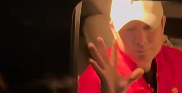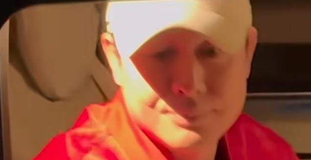 视频中张颂文头戴着白色的棒球帽,穿着红色的羽绒服。