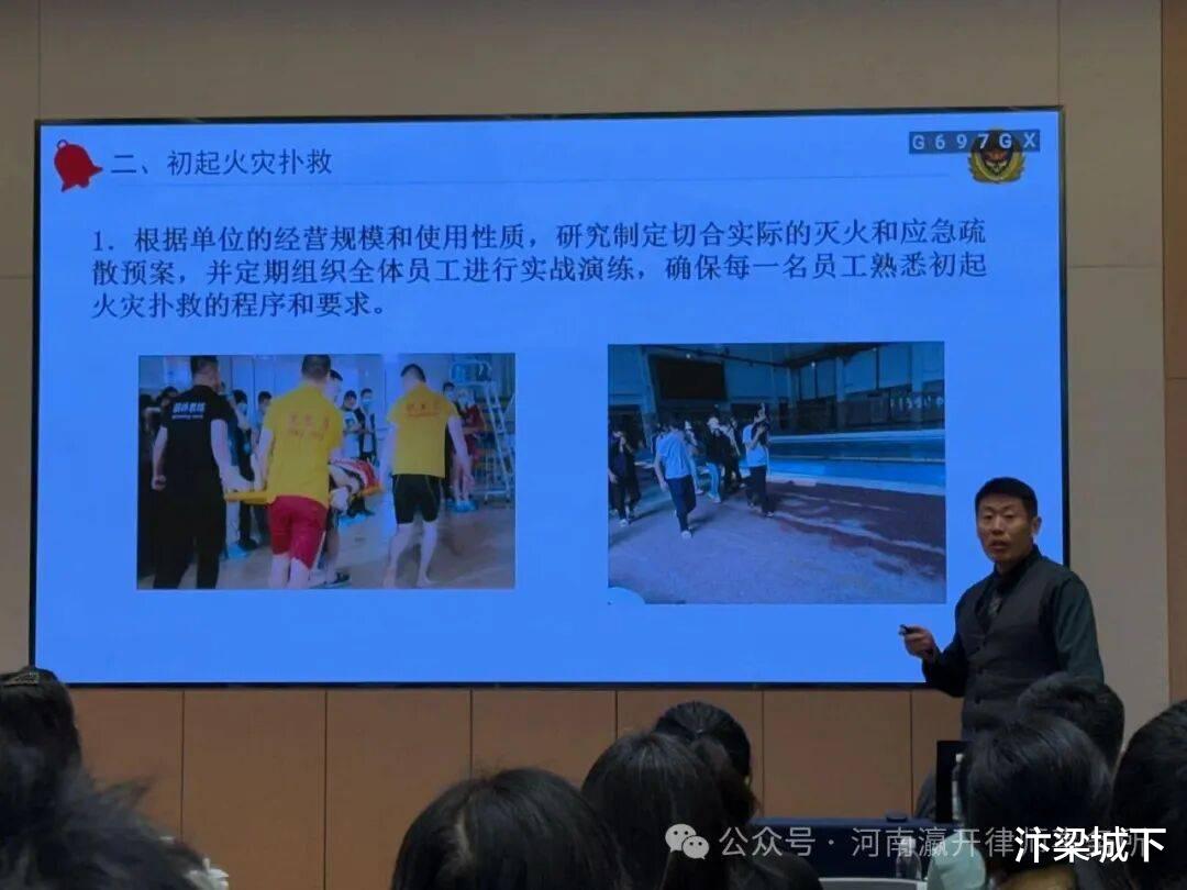 授课中,刘洋律师根据自己多年的消防工作经验,结合具体案例为参训人员讲解了火灾预防、初起火灾扑救、火场疏散逃生等重点问题,并结合《消防法》《河南消防条例》等法律法规,强调了单位的法律责任,给参训人员敲响了警钟。最后,刘律师还根据参训单位的生产经营特点,重点讲解了安全防护义务、用工风险、预付式消费等法律风险的防范及化解方法。