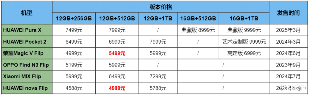 我们以主流的12GB+512GB版本为例,目前最新发布的华为Pura X阔折叠屏手机售价最高,达到7999元。而已发布一段时间的华为nova Flip降价后售价最低,为4988元。在华为nova Flip未降价前,荣耀Magic V Flip是最便宜的一款。