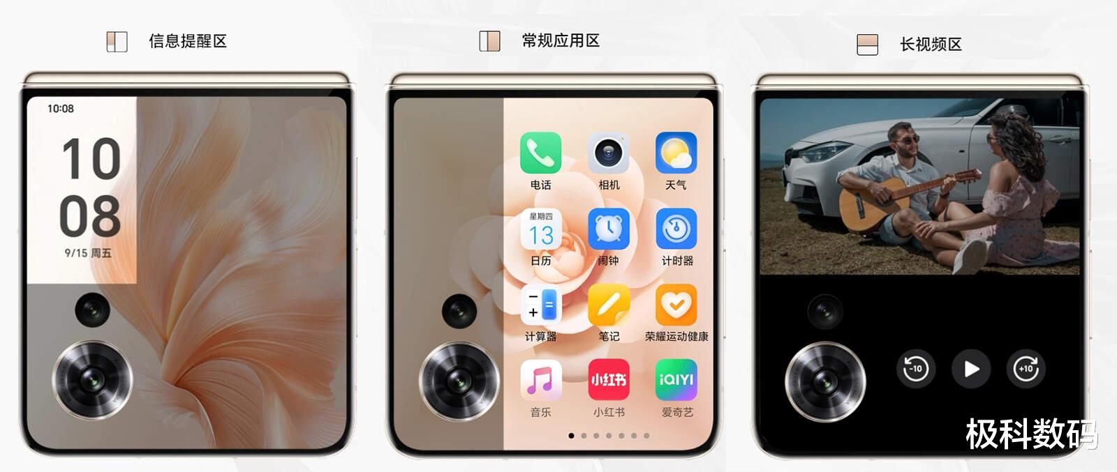 荣耀Magic V Flip 支持多种外屏玩法,在大尺寸外屏的基础上,把外屏分为:
