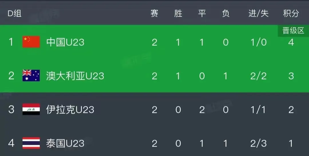本轮另一场比赛,伊拉克1-1战平泰国。两轮战罢D组积分榜为: