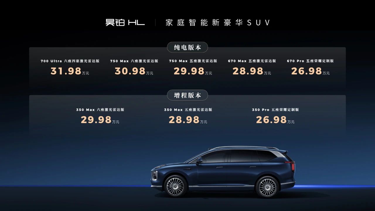 纯电/增程价格全覆盖26.98万-31.98万。标配高阶智驾、空气悬架、真皮大沙发、电吸门、智能娱乐、六屏交互。相较4月份上市的多款30万-40万的新能源SUV,昊铂HL在性价比方面直接横扫。