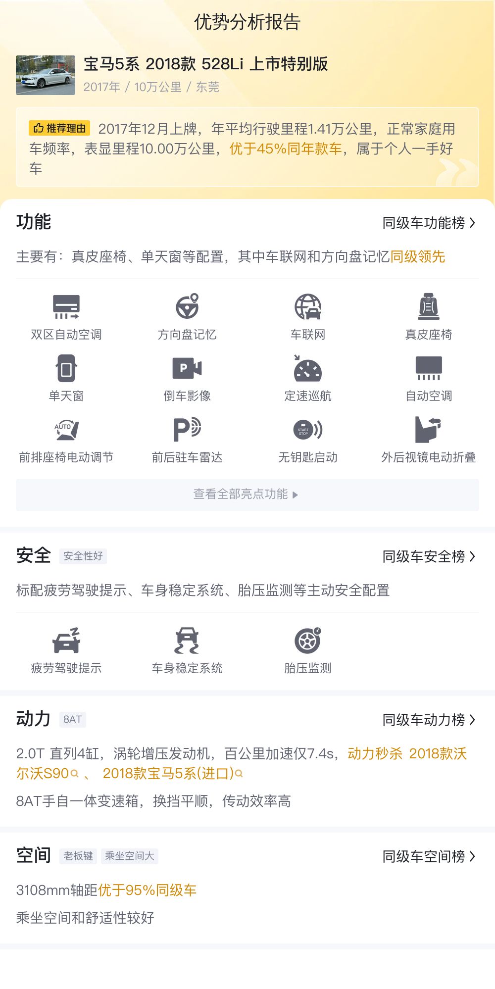 除了外观和内饰的真实情况,相信很多车友都比较关注这辆车的配置情况。这辆车配备了真皮座椅、单天窗等配置,其中车联网和方向盘记忆同级领先。从动力方面来看,这辆车搭载了2.0T 直列4缸,涡轮增压发动机,百公里加速仅7.4s,动力秒杀2018款沃尔沃S90、2018款宝马5系(进口),8AT手自一体变速箱,换挡平顺,传动效率高。在乘坐空间和舒适性方面,这辆车的轴距达到了3108mm,优于95%同级车。