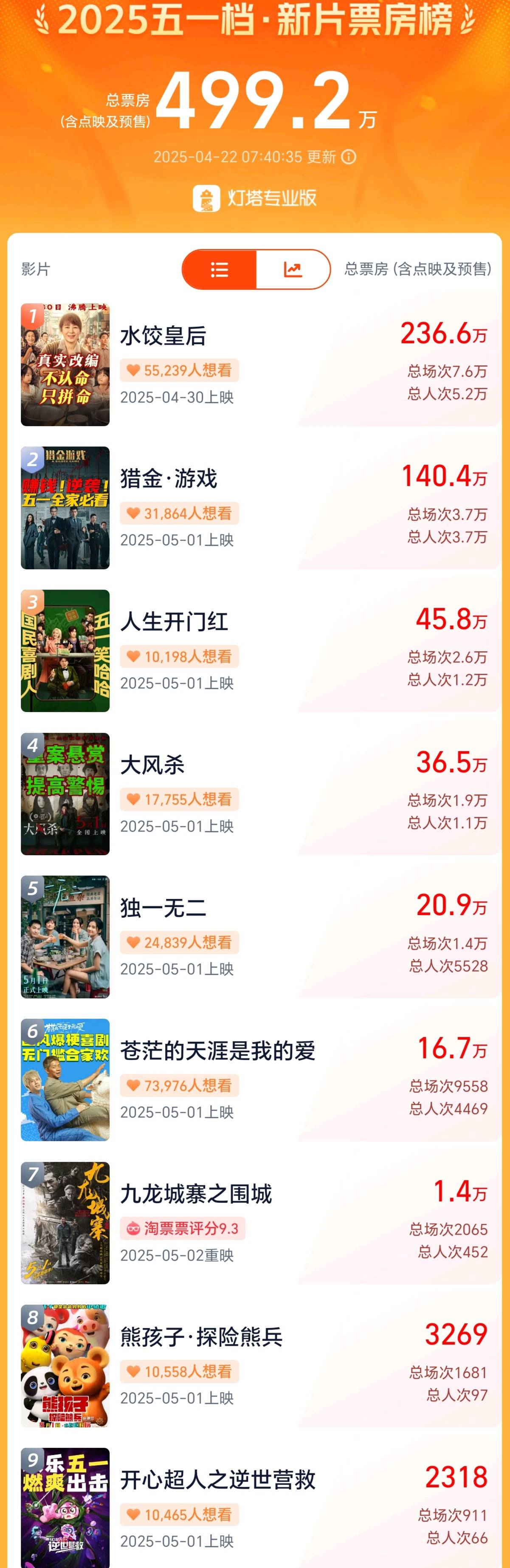今年的五一档电影市场,就像一锅没烧开的水——看似热闹,实则温吞。11部新片扎堆上映,预售成绩却惨淡得让人意外。截至4月22日,累计预售票房才勉强突破500万元,这个数字甚至比不上某些热门电影首映当天的零头。