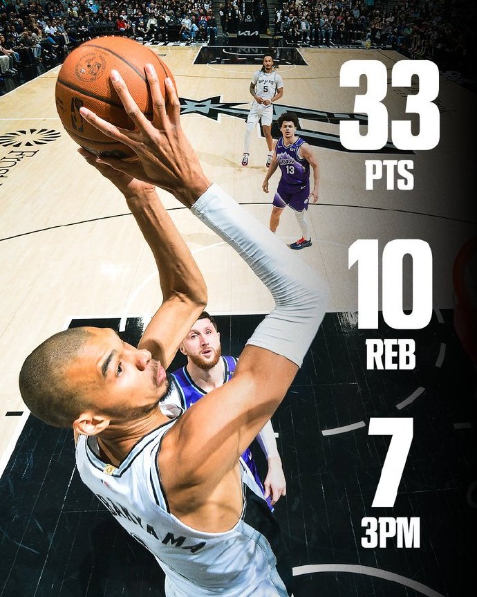除了文班,马刺还有6人得分上双。福克斯表现全面,出场33分钟,11投6中,三分3中2,拿到14分5篮板8助攻4抢断,正负值+24全队最高。卡斯尔稳定发挥,出战31分钟,投篮9中5,三分4中1,罚球10中7,得到18分2篮板8助攻2盖帽。哈珀相当高效,替补出战25分钟,投篮7中6,三分2中1,罚球2中2,得到15分2篮板5助攻1抢断1盖帽。