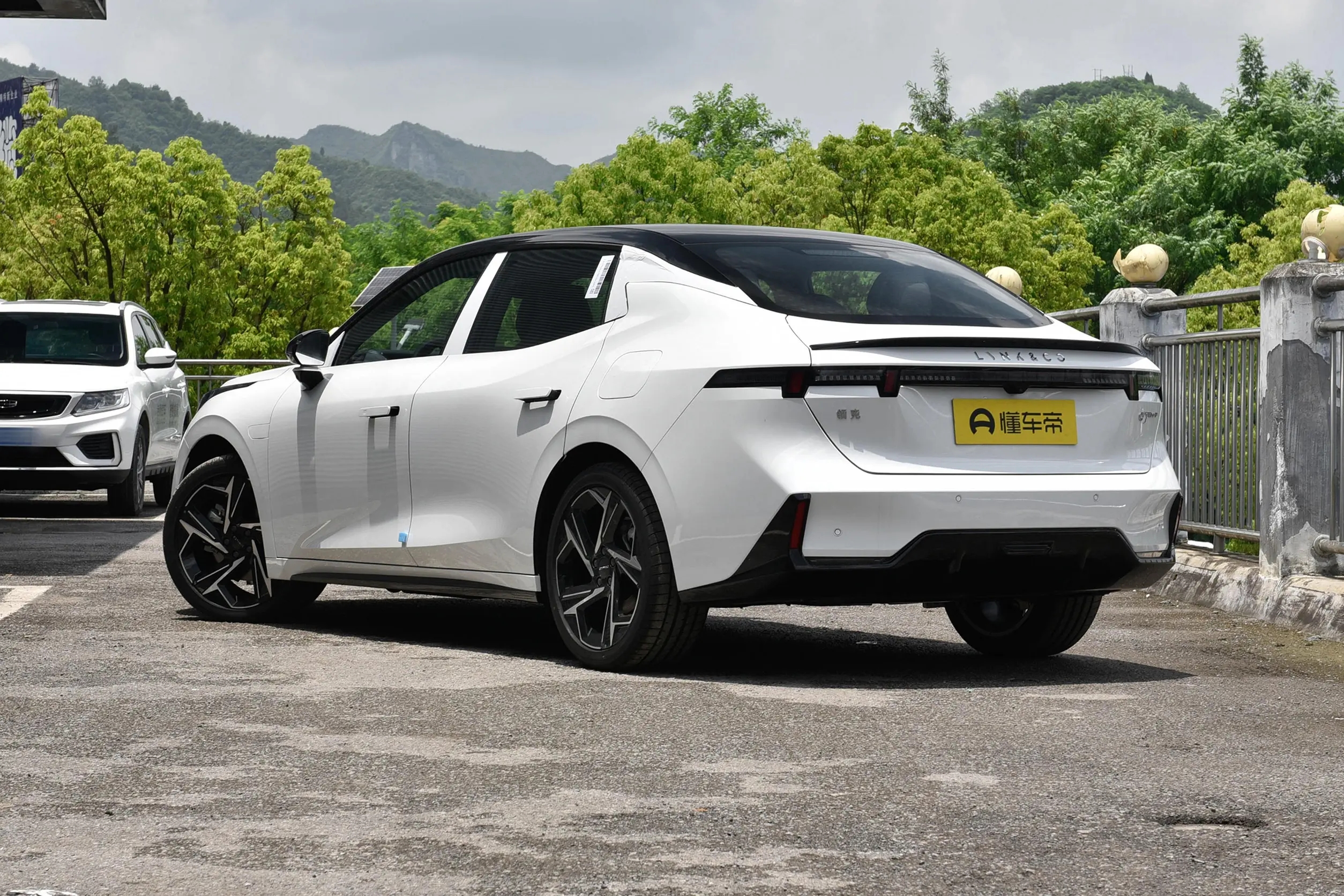 来到侧面,和大部分叫中级轿跑不一样,领克07 EM-P的车顶较为平直,从C柱位置开始向下大角度倾斜,多了几分跨界风味,懂王称其为“重型轿跑”。这种设计也让后排头部空间更出色,提升空间利用率。