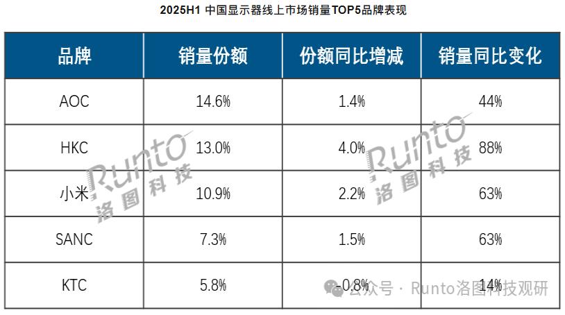 在2025年,显示器品牌的竞争格局正在朝着强者更强的趋势发展。AOC、HKC、小米、华硕等品牌的销量持续增长。其中AOC作为常年霸榜的销冠品牌,其产品线丰富覆盖了从电竞、办公、专业等各个细分领域的高中低端,具备了强大的品牌号召力,而且其产品的性价比也相当不错,所以在销量和份额上一直保持领先。而销量排行榜的第二名则一直由HKC把持,其一直深耕电竞市场,以高性价比成功地吸引到了用户。小米虽然表现低调,但是凭借办公+入门电竞的策略,特别是100Hz办公显示器的大卖,在销量上表现稳健,逐渐坐稳线上市场销量第三的宝座。在上半年,AOC、HKC和小米三个品牌合计市场份额达38.5%,较去年同期提升了7.5个百分点。第三季度,这三个品牌的销量份额也达到了38.2%。