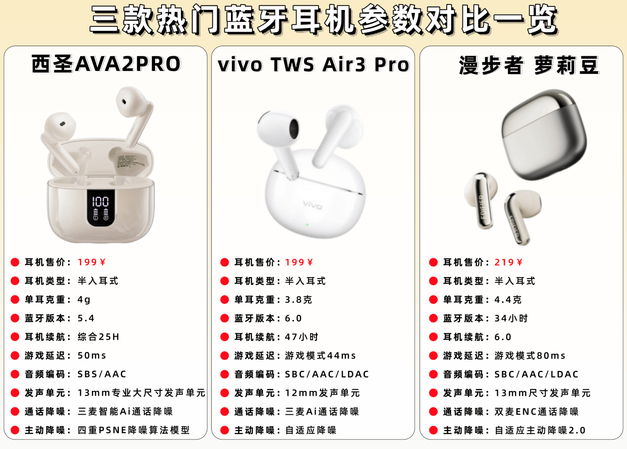 基于自己长期折腾蓝牙耳机的真实经验,这次我从同价位里挑出了三款讨论度很高的百元蓝牙耳机—漫步者萝莉豆、西圣 AVA2 Pro、vivo TWS Air3 Pro,我从音质表现、佩戴舒适度、降噪与通话、续航能力以及整体性价比这几个最核心的使用维度,进行一轮评测对比体验,看看在百元价位里,谁才是真正值得买、能放心用的那一款!