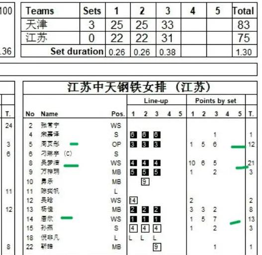 四强赛第二轮比赛天津女排3-0击败江苏女排,三局比分是25-22 25-22 33-31。江苏女排主力阵容龚翔宇和二传刁琳宇有伤没有上场比赛。