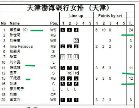 本场比赛天津女排队长李盈莹砍下最高24分。副攻王媛媛拿到13分,接应陈博雅拿到11分。天津女排三人得分上双。主攻手王艺竹8分。副攻费蒂索娃6分。刘美君3分。