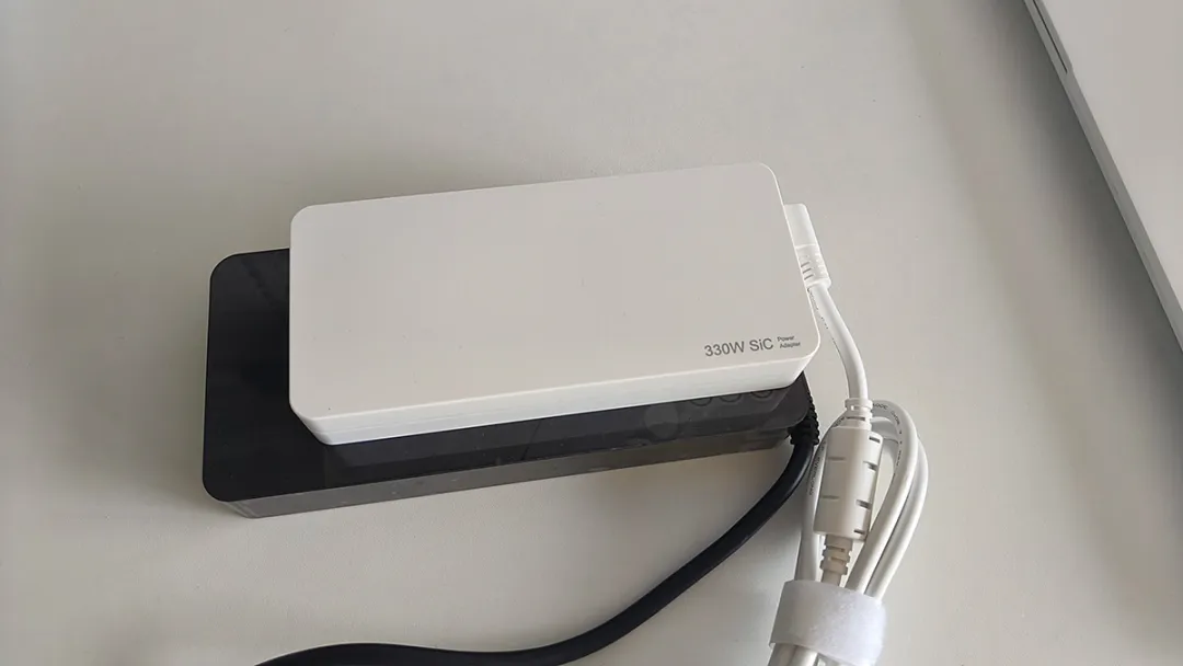 标配的330W碳化硅适配器也是白色,而且体型非常小巧,连同电源线重量771g,和友商330W氮化镓适配器对比一下,显然还是机革的更利于长途外出携带。