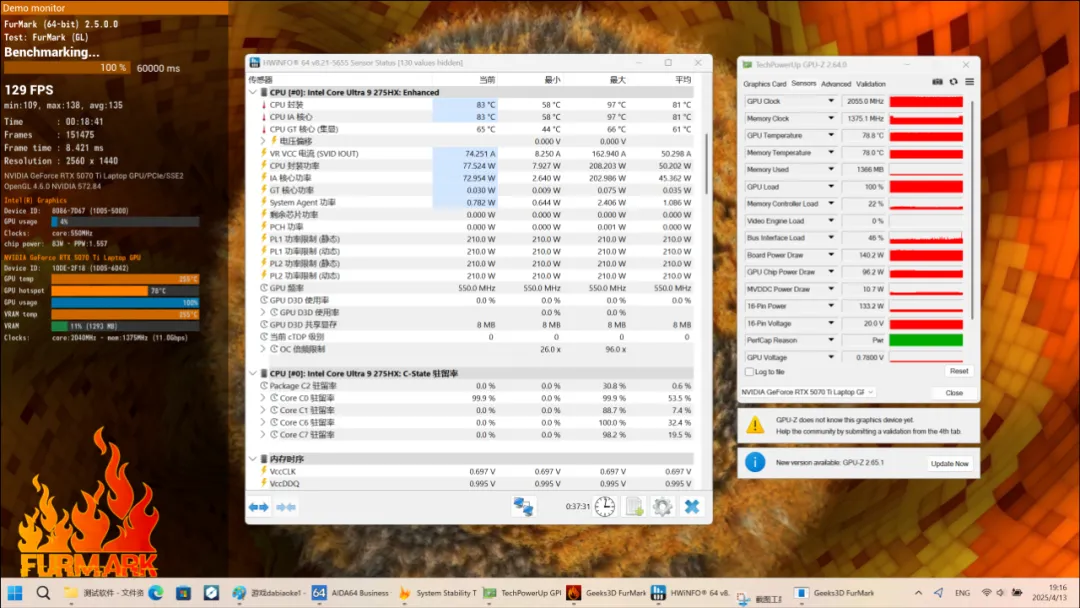 在双烤测试中,耀世16 Ultra的显卡功耗始终稳定在140W满血状态,CPU功耗则在70W左右,合计在210W左右(关闭 Secure Boot可稳定在215W)。在双烤过程中,CPU核心温度83度,GPU温度不足79度,插线板上监测的整机功耗接近260W。