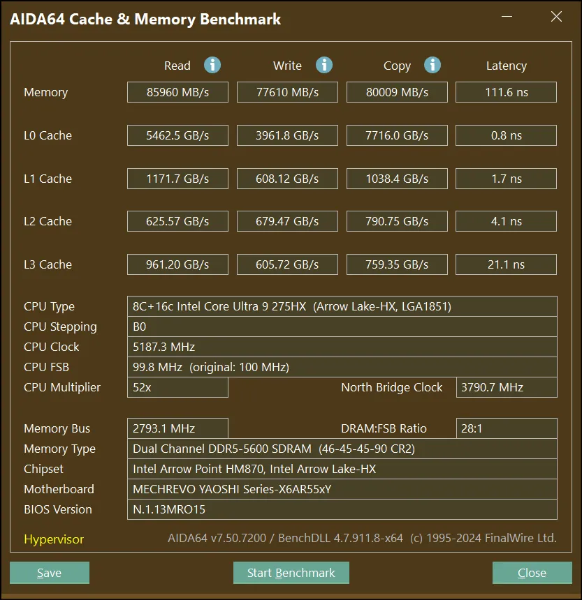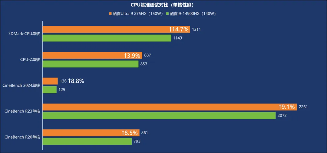 对比测试也验证了这个猜测。健圣早前曾评测过搭载i9-14900HX(24C/32T,5.8GHz,140W功耗释放)的某上代旗舰,正好可以拿来与耀世16 Ultra进行对比。首先是CPU单核性能的基准测试,275HX的3DMark的CPU测试成绩较之14900HX提升14.7%,CPU-Z提升3.9%,CineBench 2024提升8.8%,R23提升9.1%,R20成绩提升8.5%,综合一下单核性能平均提升9%。