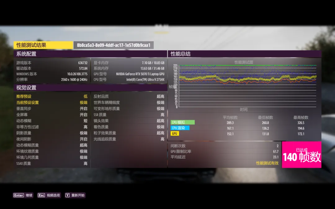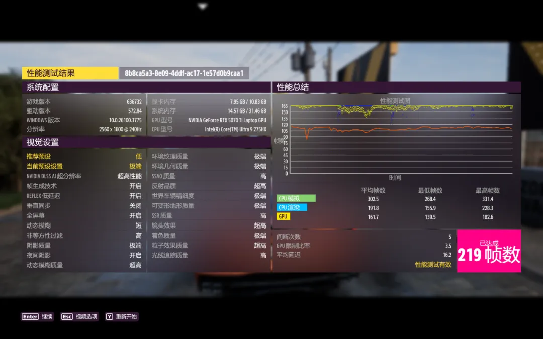 《地平线5》,极端画质下平均帧数140FPS,开启DLSS超高性能帧数可提升到219FPS。