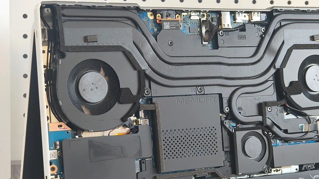拆下底盖后可见,RTX5070Ti版的耀世16 Ultra,并没有在散热设计上缩水,依旧是和顶配版相同的2025冰河散热架构,包含2大1小3风扇+内嵌水路的全铜均热板+5根热管(其中1根在内部给显存散热)以及内吹风设计,搭配导热效率优秀且没有偏移风险的纳米相变散热硅脂,主板上绝大部分发热源的表面都覆盖了散热铠甲,肉眼可见的规整和豪华。