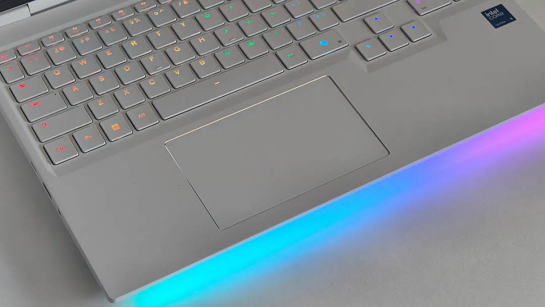 耀世16 Ultra的LOGO位于顶盖中间偏上的位置,内藏RGB呼吸灯。机身前端也暗藏由54颗灯珠组成的RGB海岸线灯带,在昏暗环境下可以呈现炫酷的光污染效果,可以助玩家更好地沉浸在游戏世界。