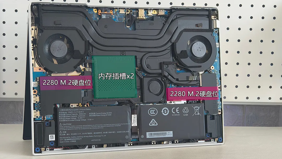耀世16 Ultra配备2个内存插槽,2个M.2硬盘位,表面均覆盖有散热装甲。