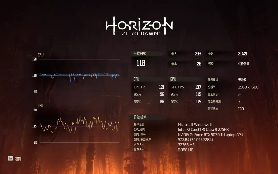 《地平线 零之曙光》,终极质量画质下的平均帧数118FPS。