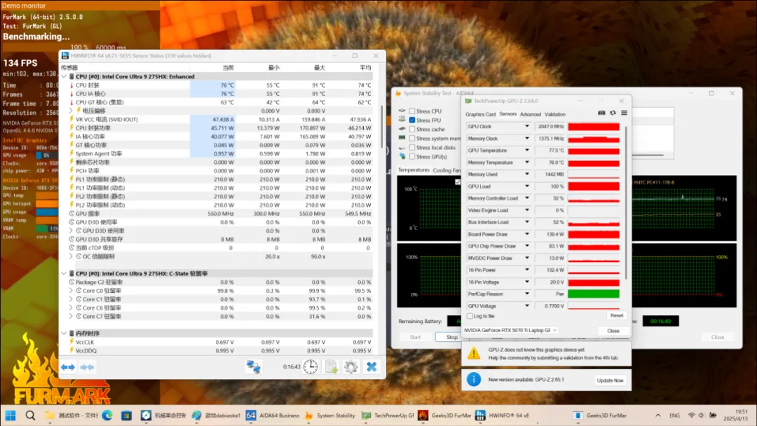 在室温25度,环境噪音32分贝,将笔记本尾部垫高的情况下运行AIDA64的FPU烤机测试,处理器初始峰值功耗超过了200W大关,随后会逐步下降并在150W左右。此时CPU温度95度,P核心频率最高约4.5GHz,E核心频率最高约4.0GHz。