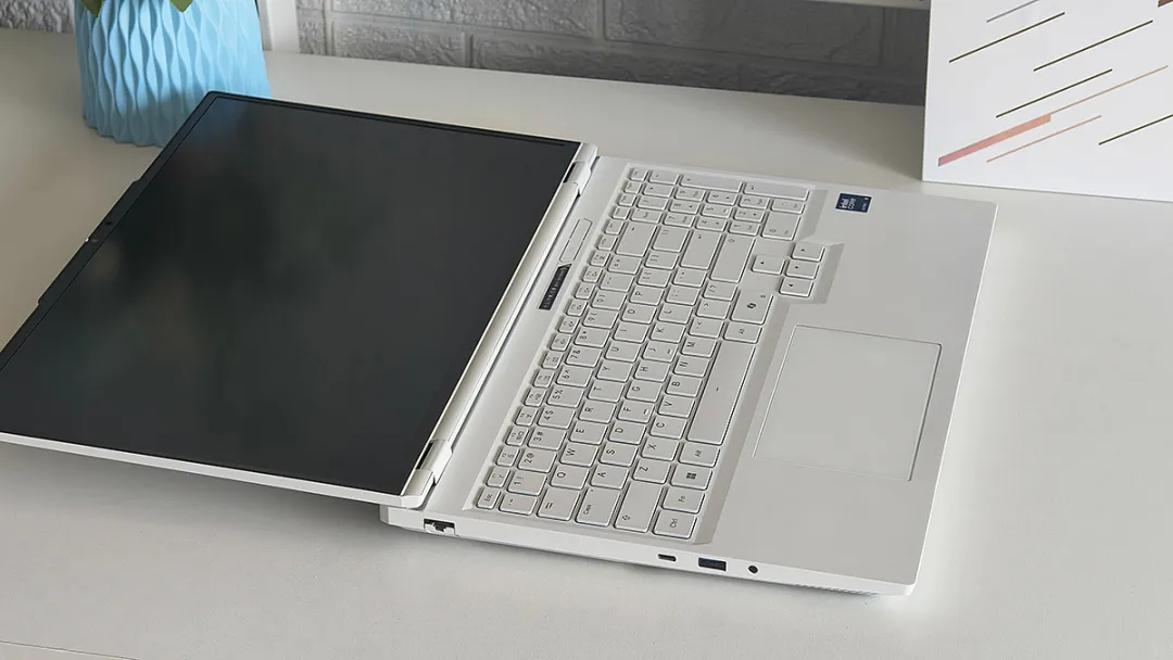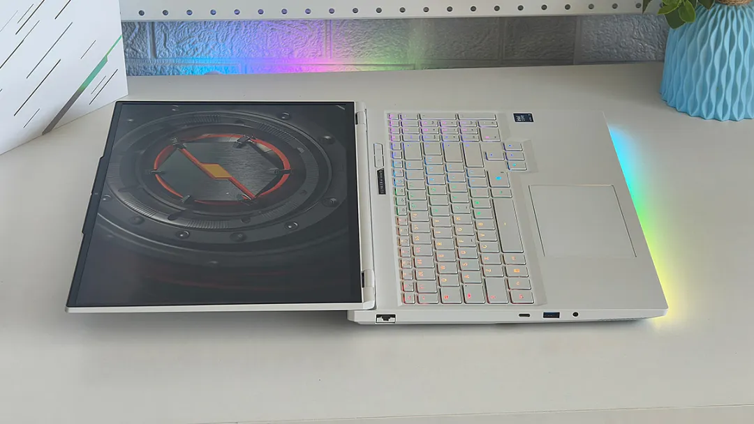 耀世16 Ultra的ACD面均为金属材质,整机刚性和质感接近CNC一体精雕,并将屏幕立式转轴置顶前移,单手即可实现180度开合。