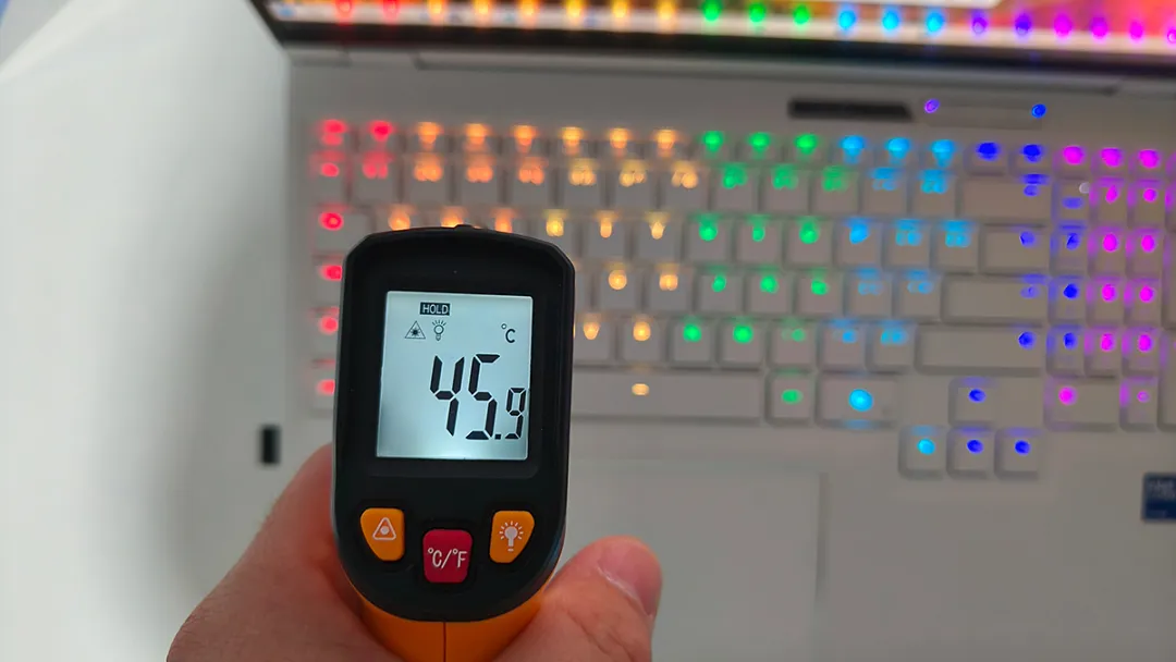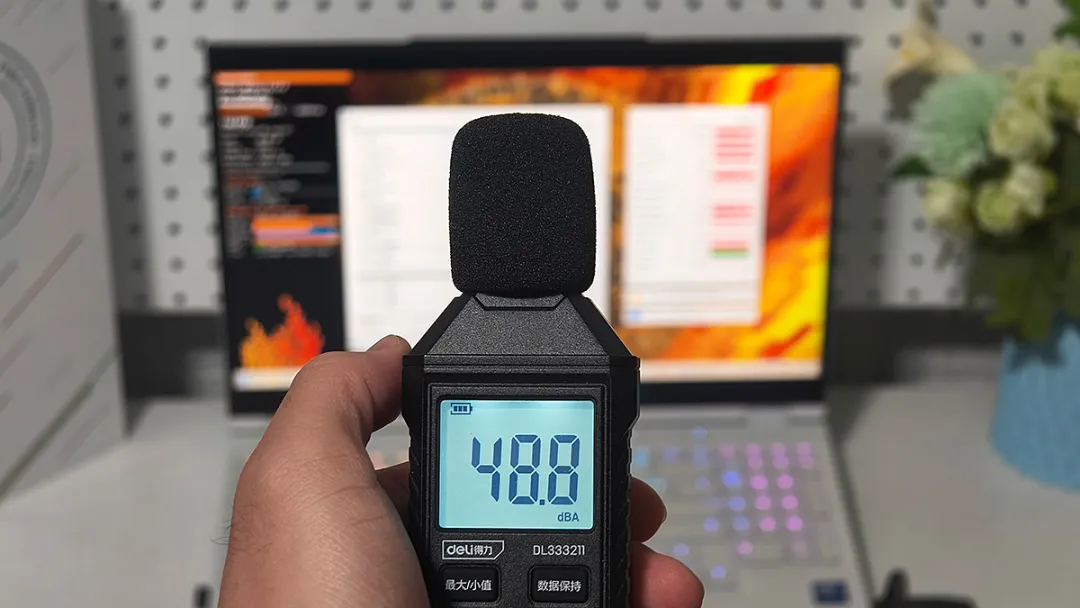 双烤时,人位的噪音值在53分贝左右,与玩家接触最频繁的WASD按键区域46度左右,F键和C键之间的区域达到了51度,左侧掌托大约41度,键盘区域的温控表现一般。