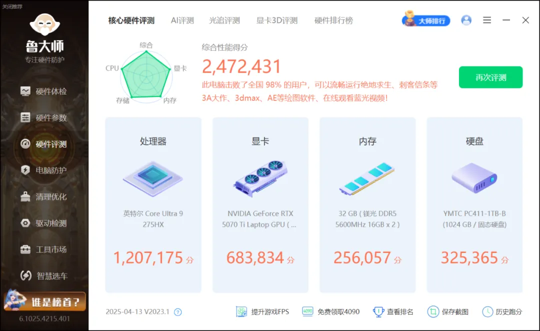接下来是实测跑分环节,鲁大师测试总成绩247万,击败了全国98%的电脑用户。