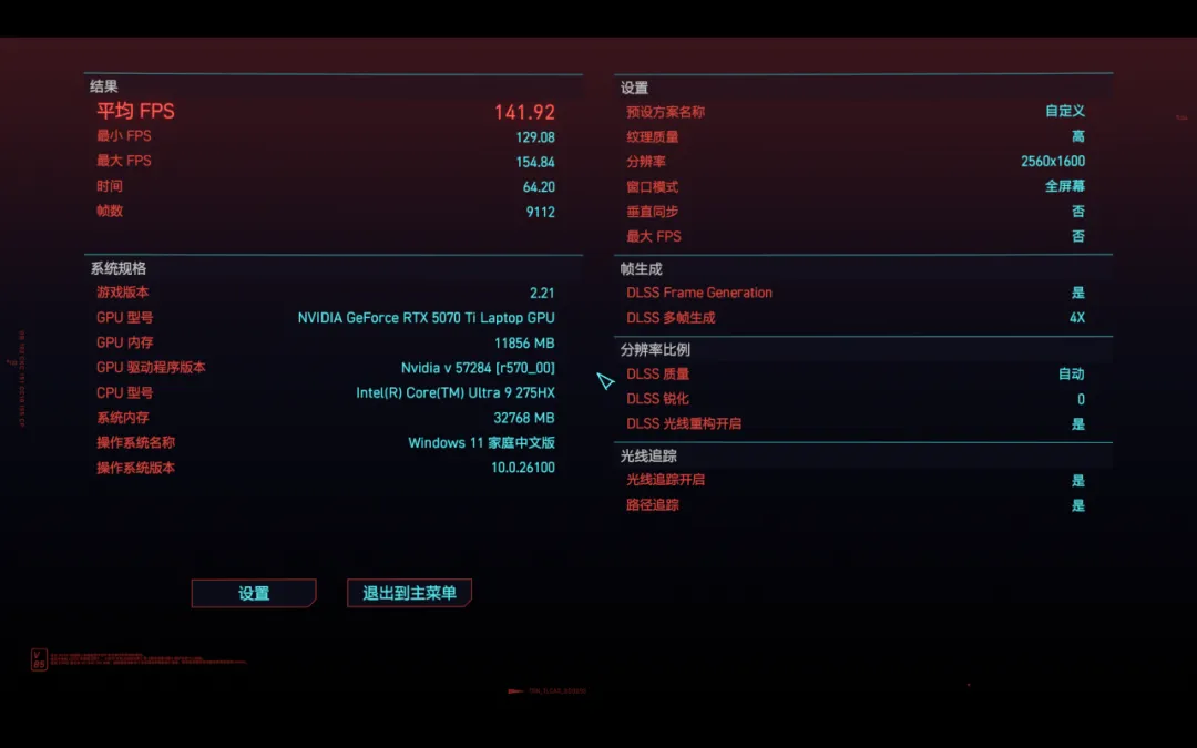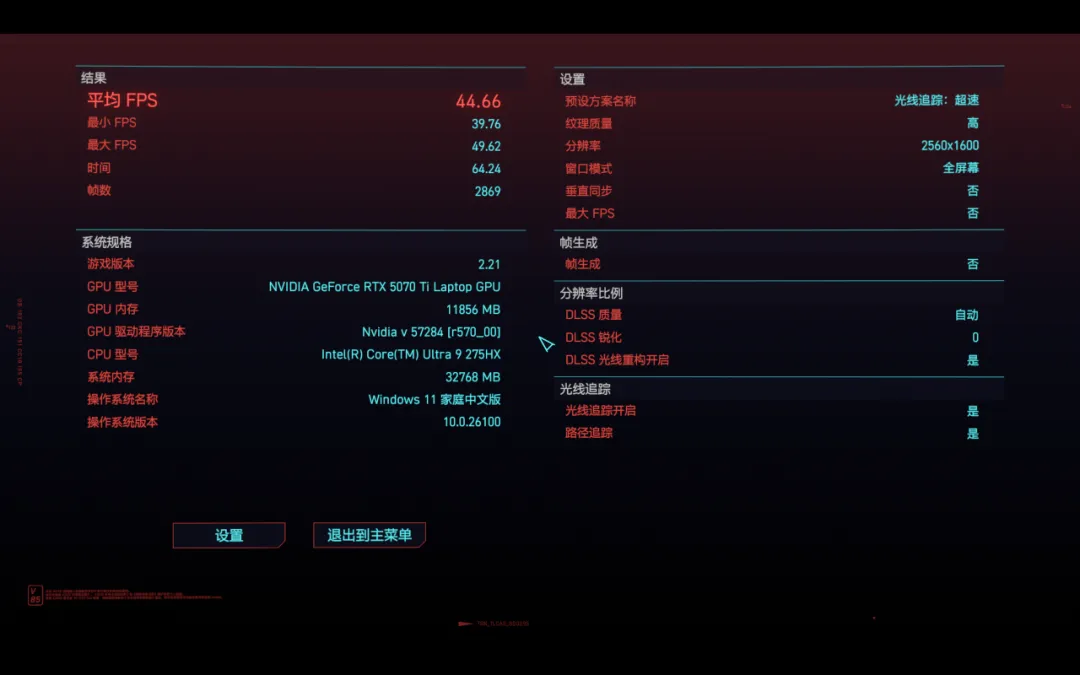 《赛博朋克2077》光线追踪超速的预设画质下,平均帧数44FPS。开启4X的DLSS后,平均帧数大涨至142FPS。