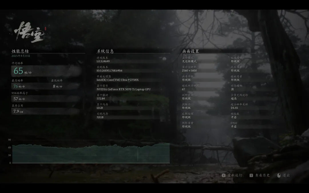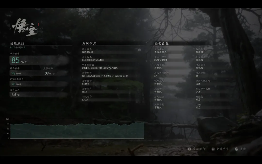 《黑神话悟空》,影视级预设画质平均帧数85FPS,开启超高的全景光线追踪,平均帧数也有65FPS。
