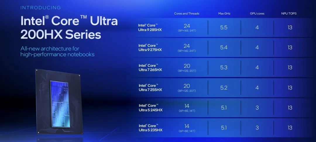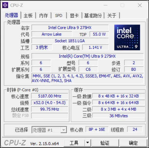 酷睿Ultra 9 275HX采用8个性能核心(Lion Cove)和16个效率核心(Skymont),共计24核心24线程,最高睿频加速频率可达5.4GHz,内置36MB L3缓存。
