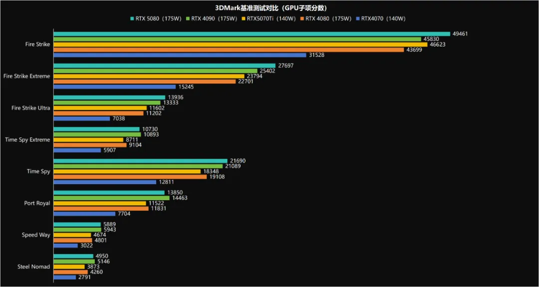 通过3DMark的基准测试,对RTX5070Ti与RTX4070、4080、4090和RTX5080进行横向对比,可见5070Ti的性能可以秒杀RTX4070这个前辈,与昔日的次旗舰4080算是五五开,可以视为同一个档次的存在了。