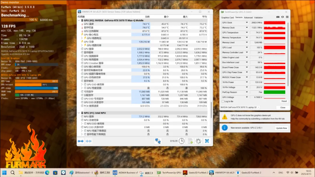 运行FurMark进行GPU单烤,显卡可以始终保持在140W左右的满血状态,GPU核心频率约2.0GHz,核心温度约74度。