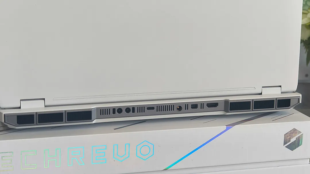 机身背部采用了撞色设计,接口面板为灰色。在这里依次配备了水冷接口,支持140W私有PD充电协议的雷电4,电源插孔,miniDP2.1和HDMI2.1接口。
